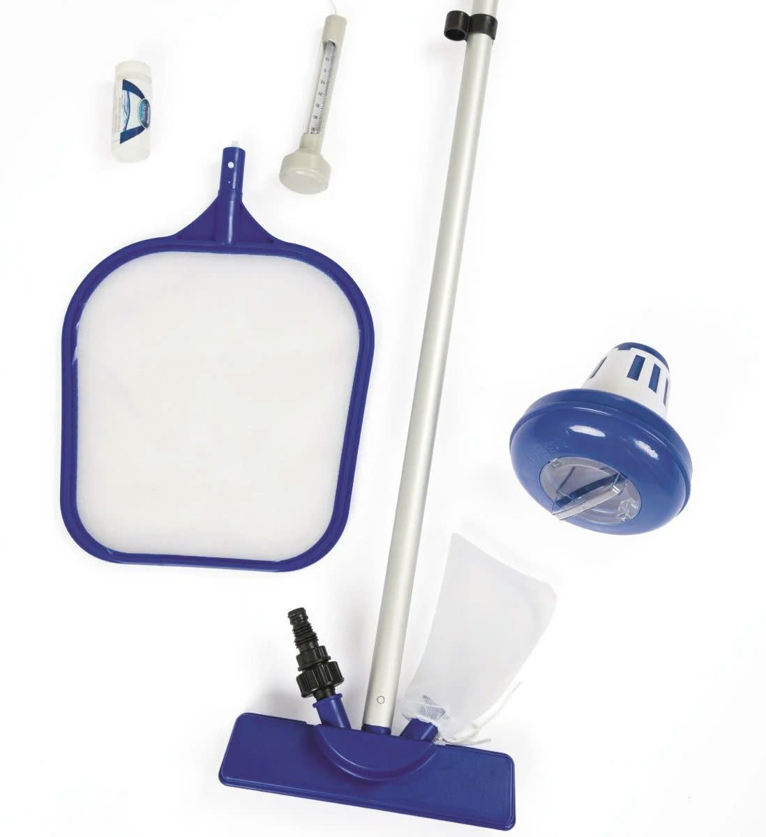 The Bestway® 80 in. Swimming Pool Maintenance Kit is the perfect starter kit for cleaning and maintaining 13 ft. and above pools. The kit includes an 80 in aluminum pole and an interchangeable vacuum and skimmer head