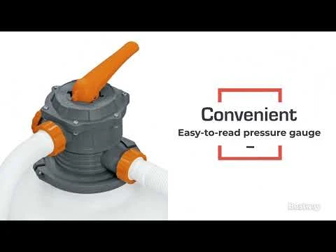 Keep crystal-clear, clean water flowing through your above ground pool with the Flowclear™ 3000 gal. Sand Filter Above Ground Pool Pump! This powerful pump systematically processes 2,200 gallons of water per hour, and is compatible with most 300 – 17,600 gallon above ground pools, as it comes with an adapter for pool valves with an outer diameter of 1.5 in (3.8 cm). Our ChemConnect™ dispenser, also included, provides a stable level of chlorine throughout your pool to maintain clean, healthy water and proper chemical balance, giving you two efficient tools to keep your pool in tip-top shape year-round! With its pre-filter strainer basket to catch large particles such as leaves and sand to capture finer materials such as hair and dirt, the Flowclear Sand Filter Pump’s durable, corrosion-resistant filter tank runs smoother and longer than traditional filter cartridge pumps. Simply add your own sand (approximately 79.4 lbs; not included) or our highly-efficient, cost-effective Polysphere™ pool filtration spheres; quickly install the preassembled pump and adjust the 6-position valve for easy, low-maintenance filter control.