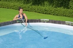- Lightweight pole with interchangeable vacuum and skimmer heads